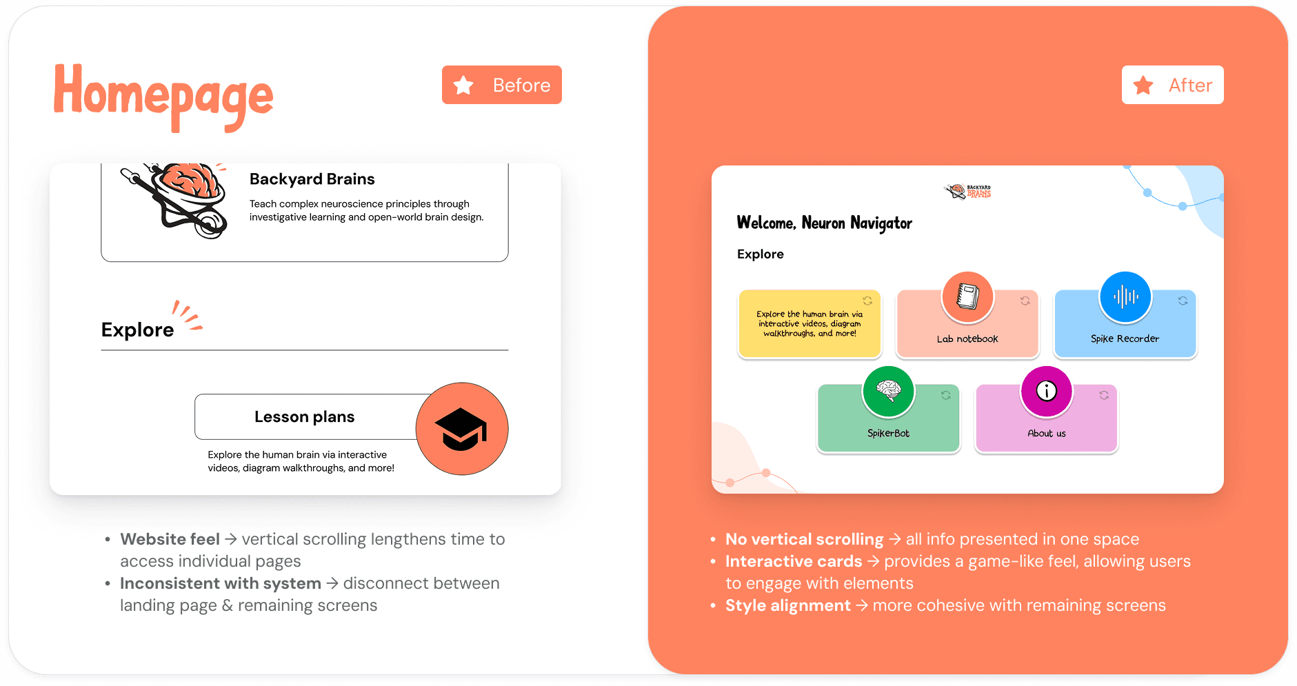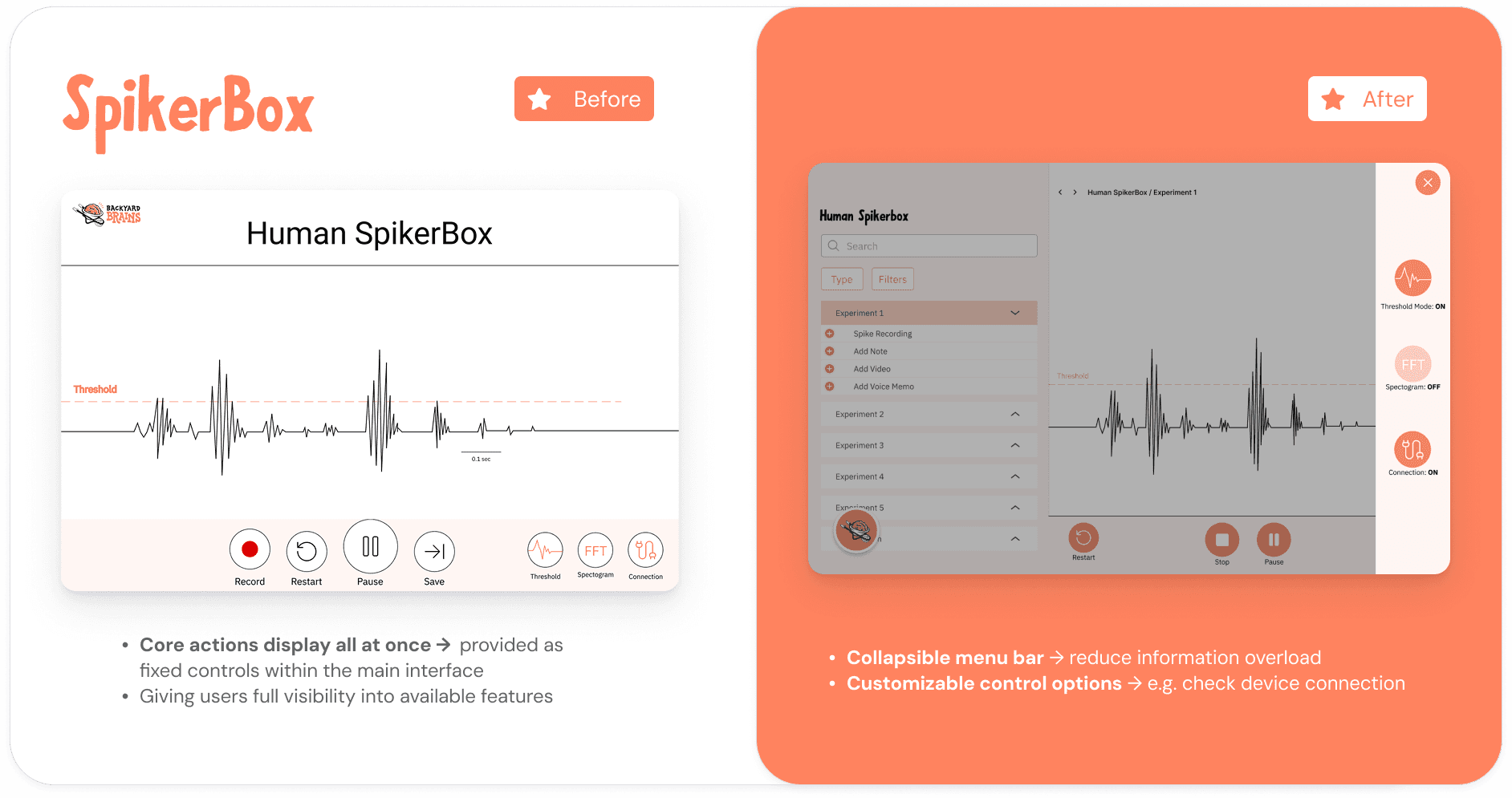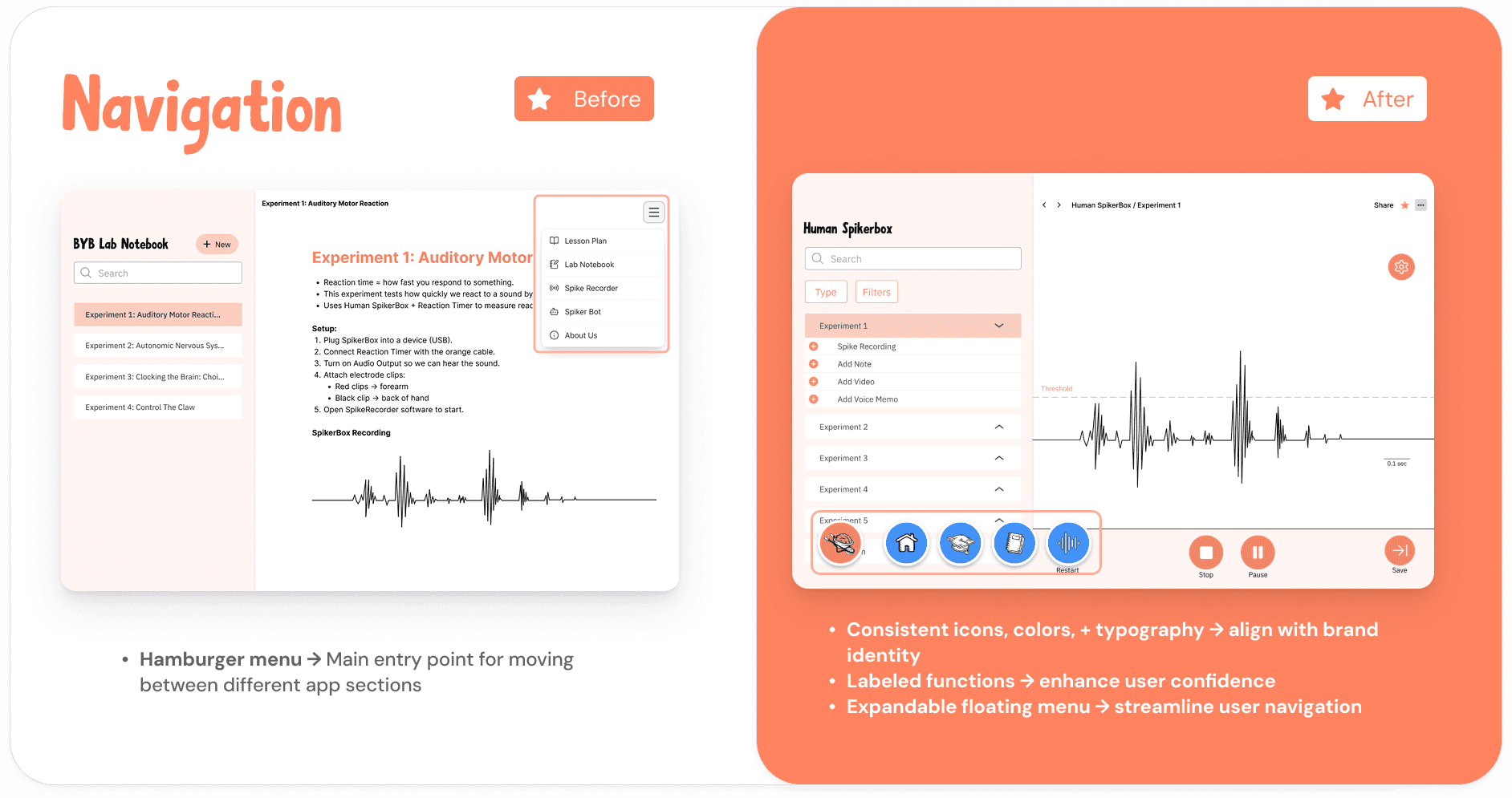 Beyond unifying the app ecosystem, we sketched out improved the SpikerBox and NeuroRobot designs with clearer feedback, streamlined controls, and learning-focused guidance. The redesign help students understand experiments more intuitively and stay engaged throughout the learning flow.