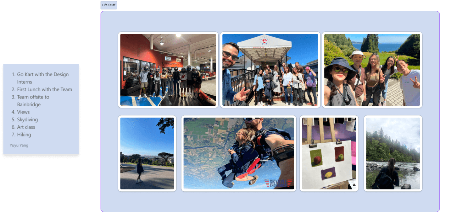 My internship was an incredible journey filled with learning, creativity, and connection. Over the 12 weeks, I had the privilege of working with some of the most talented and kind-hearted people. It wasn’t always smooth sailing—there were plenty of ups and downs along the way. But through their guidance and collaboration, I not only expanded my skill set but also grew significantly as a designer. This summer was full of bold ideas, meaningful growth, and invaluable lessons, and I’m grateful for every moment and everything I was able to learn!